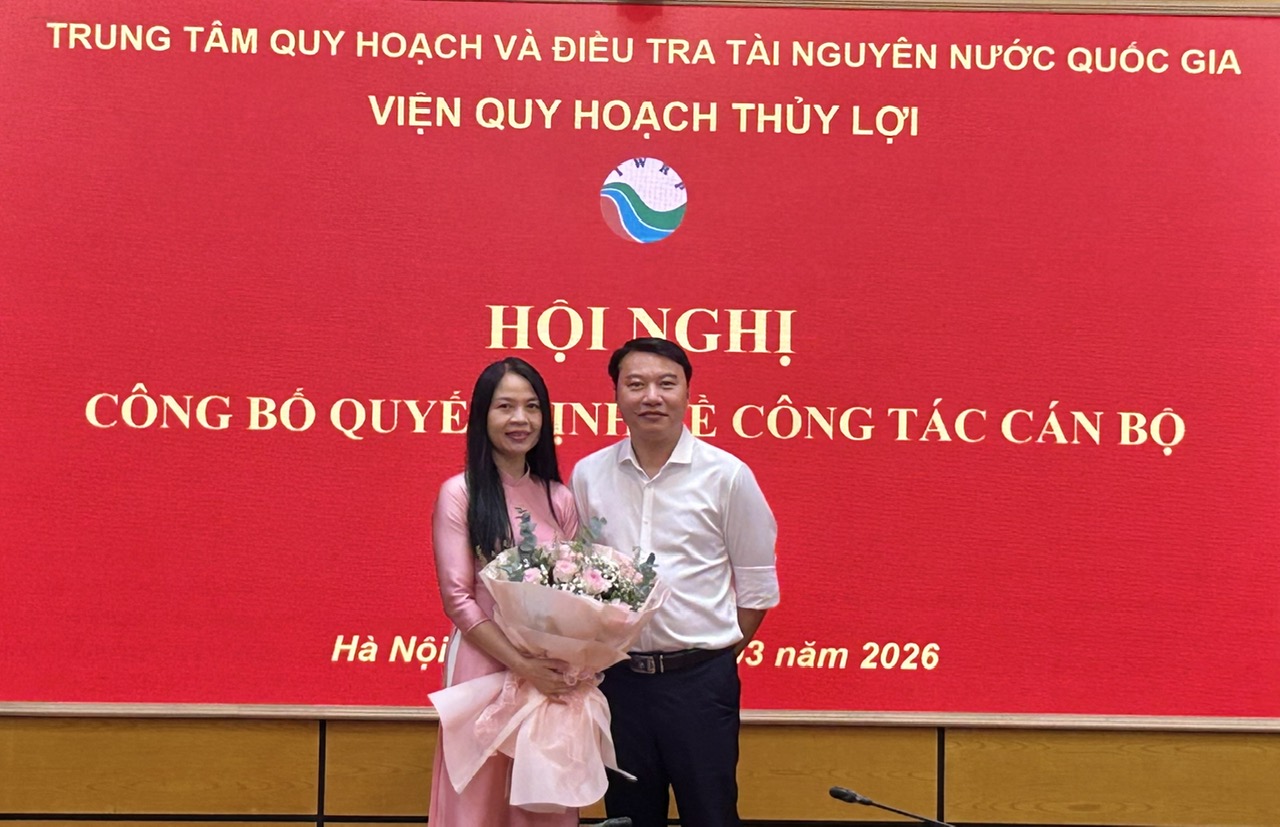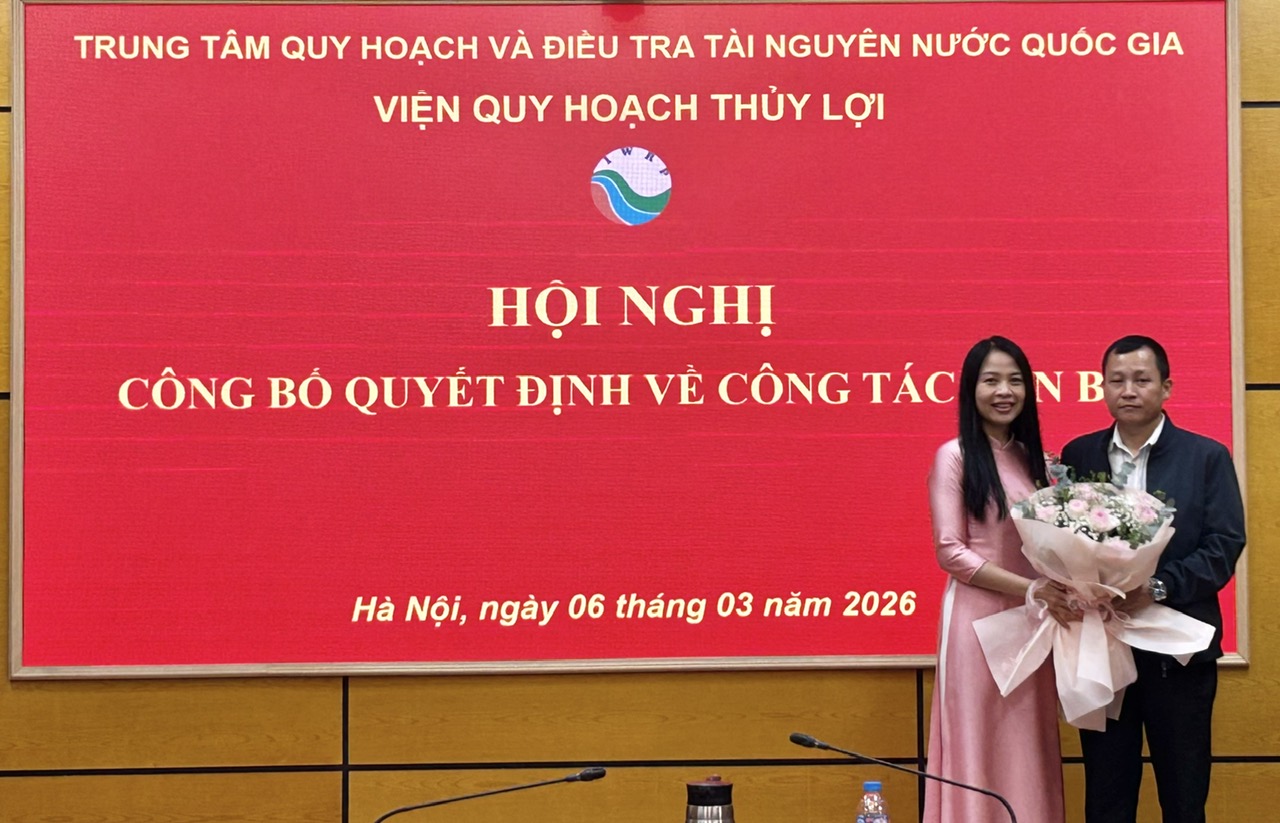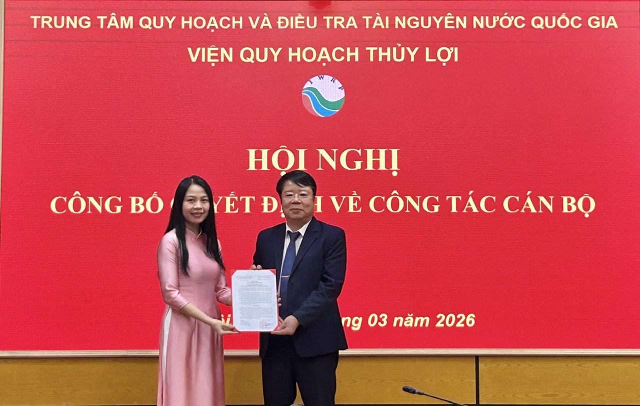 Ngày 06/3/2026, Viện Quy hoạch Thủy lợi đã phối hợp với Văn phòng Trung tâm Quy hoạch và Điều tra Tài nguyên nước Quốc gia tổ chức Hội nghị công bố Quyết định của Tổng Giám đốc về việc bổ nhiệm bà Lê Thị Mai Vân giữ chức vụ Phó Viện trưởng Viện Quy hoạch Thủy lợi.