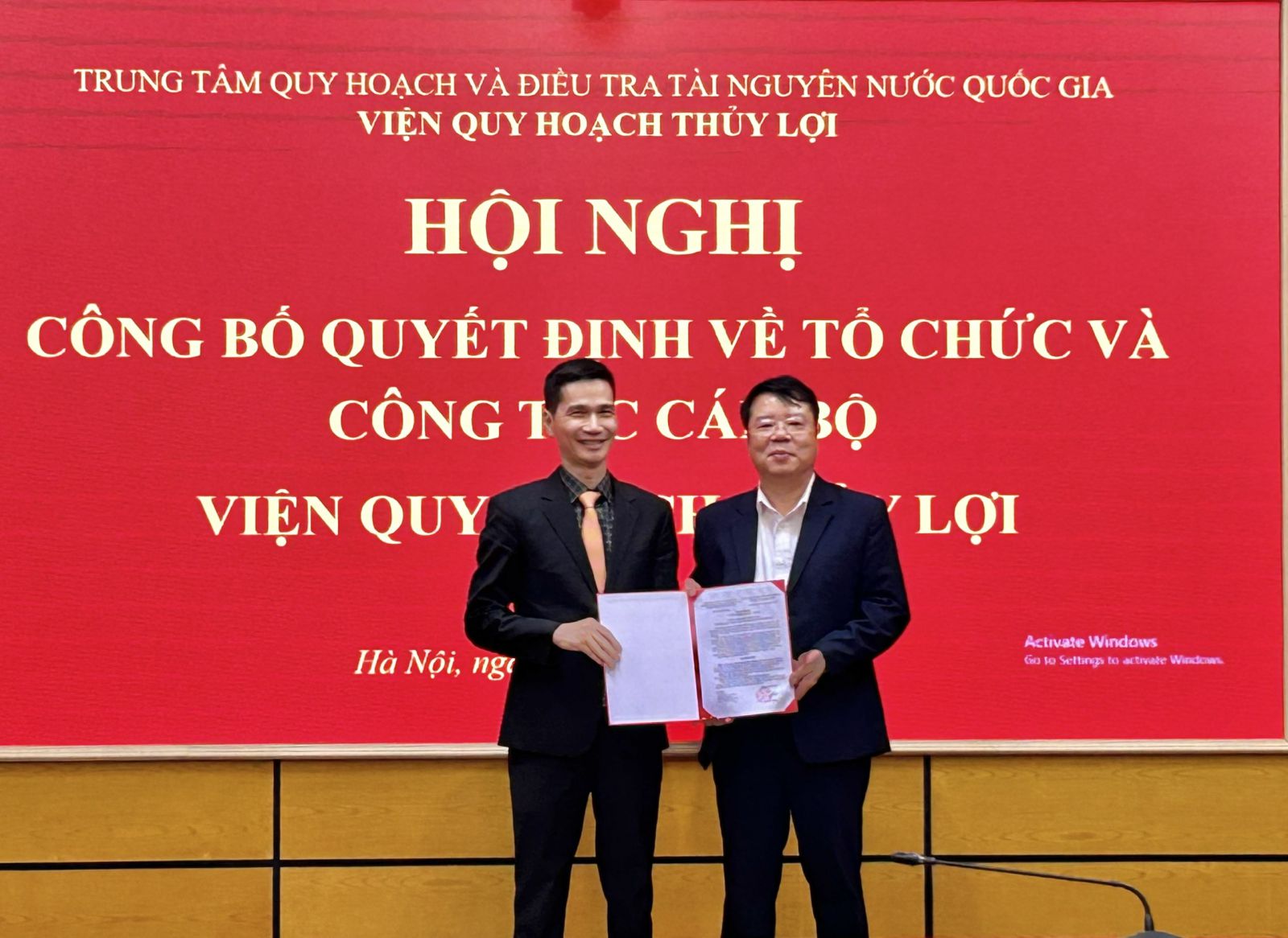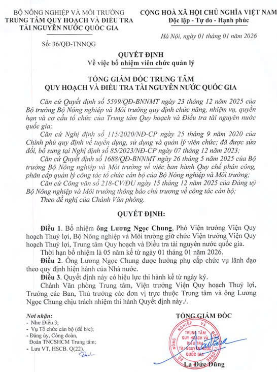 Tại Hội nghị, Ông La Đức Dũng - Tổng Giám đốc Trung tâm Quy hoạch và Điều tra Tài nguyên nước Quốc gia đã trao Quyết định bổ nhiệm chức vụ Viện trưởng, tặng hoa chúc mừng và giao nhiệm vụ cho Viện trưởng Lương Ngọc Chung. Tổng Giám đốc đánh giá cao quá trình công tác của ông Lương Ngọc Chung với 31 năm gắn bó và cống hiến tại Viện Quy hoạch Thủy lợi, bày tỏ sự tin tưởng ông Chung có đủ năng lực, kinh nghiệm và sự am hiểu sâu sắc để tiếp tục lãnh đạo Viện phát triển bền vững trong giai đoạn mới. Trong bối cảnh sáp nhập tám đơn vị vào Trung tâm Quy hoạch và Điều tra tài nguyên nước quốc gia hiện nay, chức năng, nhiệm vụ, quyền hạn và cơ cấu tổ chức của Viện Quy hoạch Thủy lợi có nhiều điều chỉnh, Tổng Giám đốc đề nghị ông Lương Ngọc Chung cùng tập thể Ban Lãnh đạo, Ban Chấp hành Đảng bộ Viện tiếp tục nghiên cứu, tổ chức vận hành bộ máy phù hợp với mô hình mới; nhanh chóng ổn định tổ chức, sắp xếp nhân sự, kiện toàn các đơn vị trực thuộc theo đúng quy định về bộ máy tổ chức của Bộ Nông nghiệp và Môi trường; đồng thời tăng cường phối hợp chặt chẽ với Trung tâm nhằm xây dựng hệ thống quản lý thông suốt, hiệu quả từ Trung tâm đến các đơn vị trực thuộc.