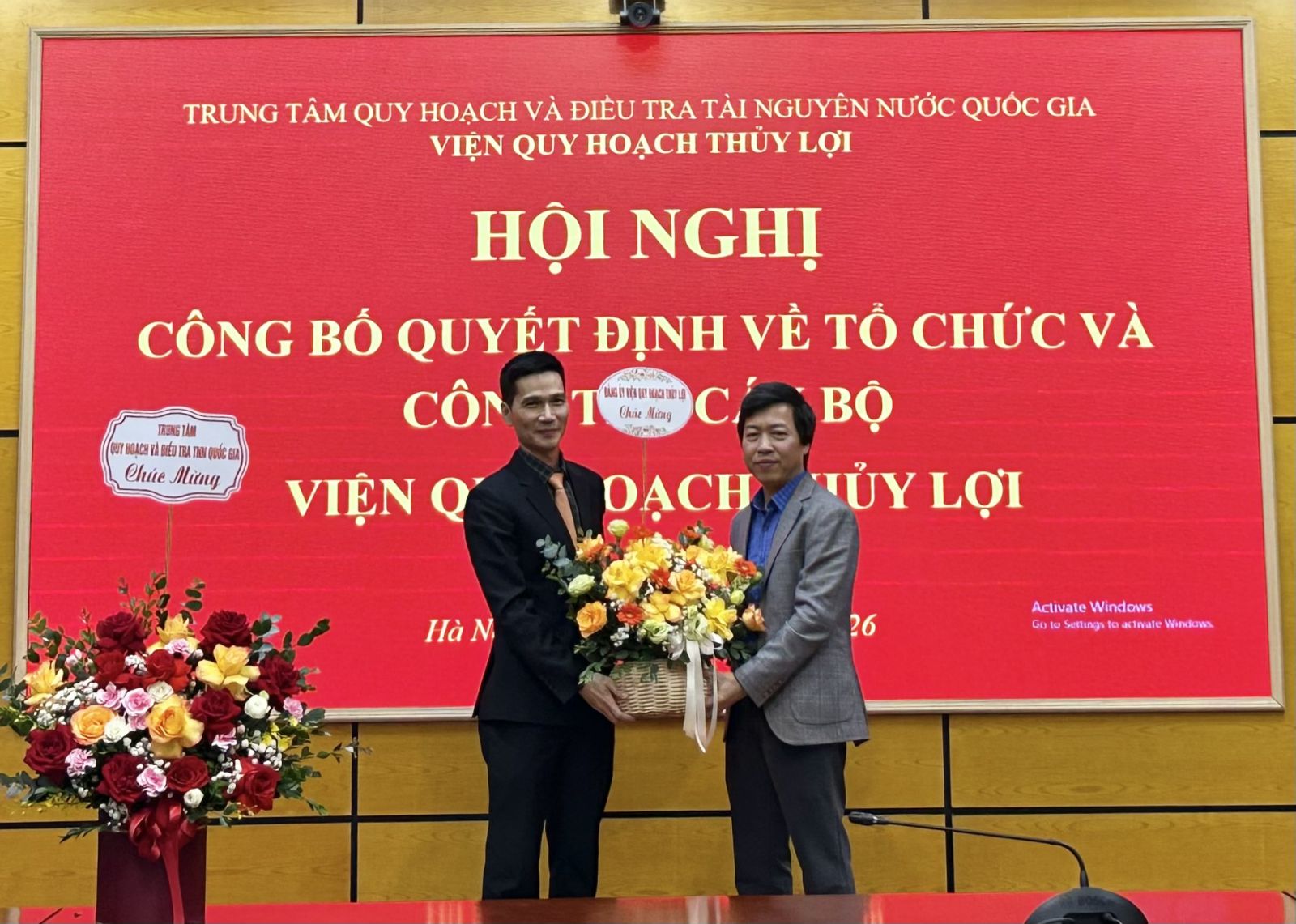 Tổng Giám đốc Trung tâm Quy hoạch và Tài nguyên nước Quốc gia La Đức Dũng trao Quyết định và tặng hoa chúc mừng Viện trưởng Lương Ngọc Chung